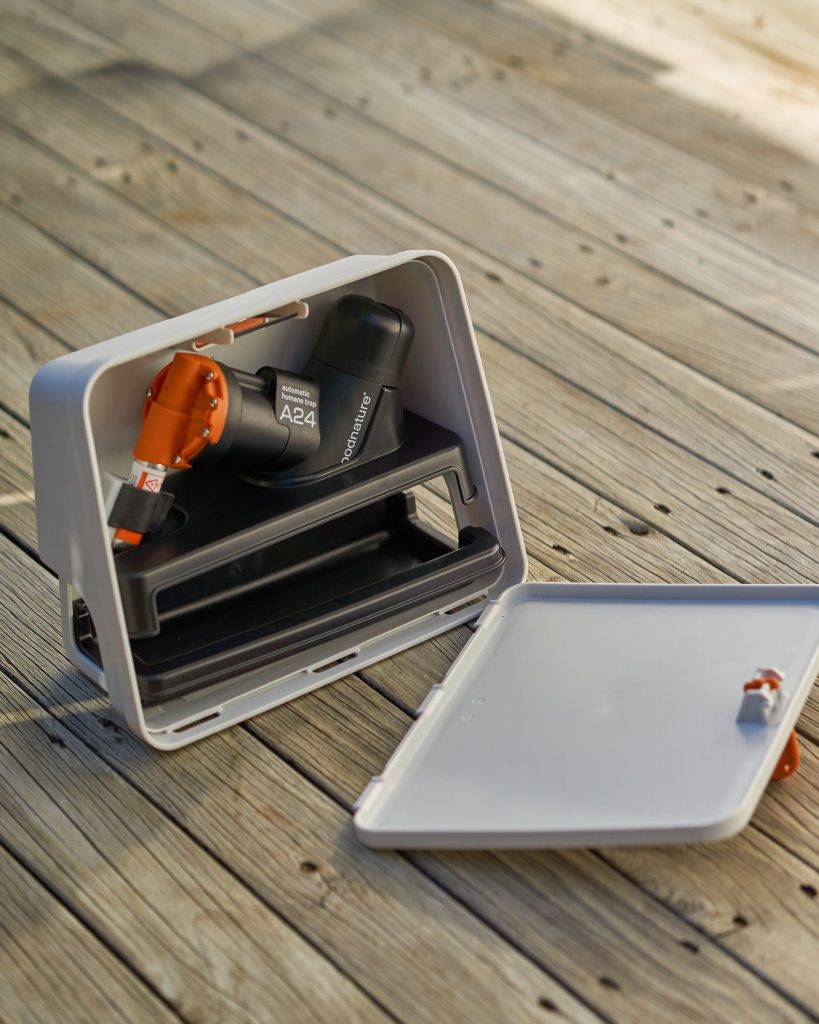 La pompe à appât automatique Goodnature® est conçue pour attirer efficacement et neutraliser le mieux possible les rats et les souris. La pompe à appât est un système à fonctionnement automatique, ce qui vous évite de devoir contrôler souvent votre piège.